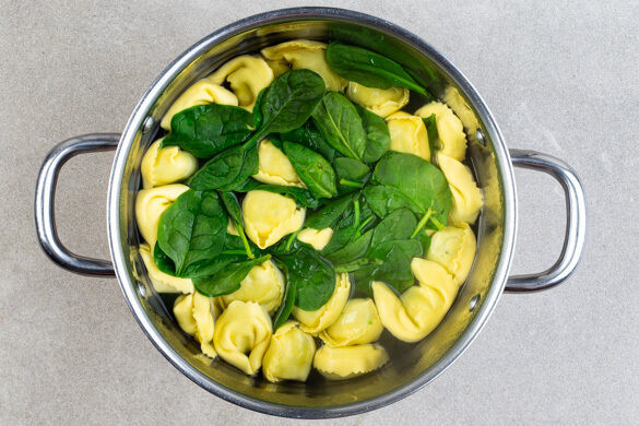 Die Pasta in das kochende Wasser geben und in 4–5Min. bissfest kochen. Den Topf vom Herd nehmen und den Spinat unterrühren und zusammenfallen lassen. Mit einer Tasse etwas Pastawasser abschöpfen, dann die Pasta und den Spinat in ein Sieb abgießen und abtropfen lassen.