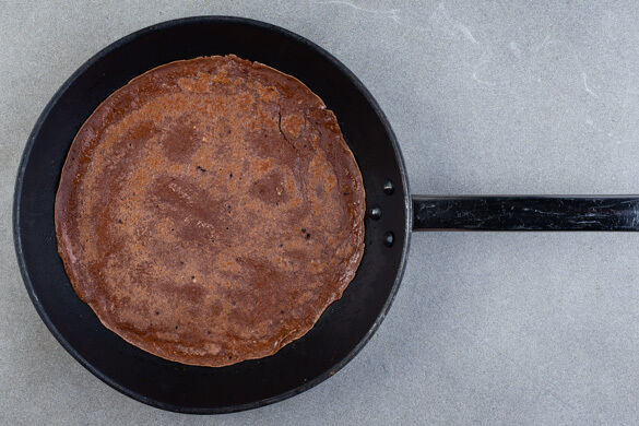 Das Mehl mit 1TL Kakaopulver, 1EL Zucker und 1 kleinen Prise Salz verrühren. In einer zweiten Schüssel die Eier mit der Milch und 1EL Pflanzenöl verquirlen, dann zur Mehlmischung geben und alles zu einem glatten, dünnflüssigen Teig verrühren. Tipp: Das übrige Kakaopulver für einen heißen Kakao oder einen Schokoladenkuchen verwenden.