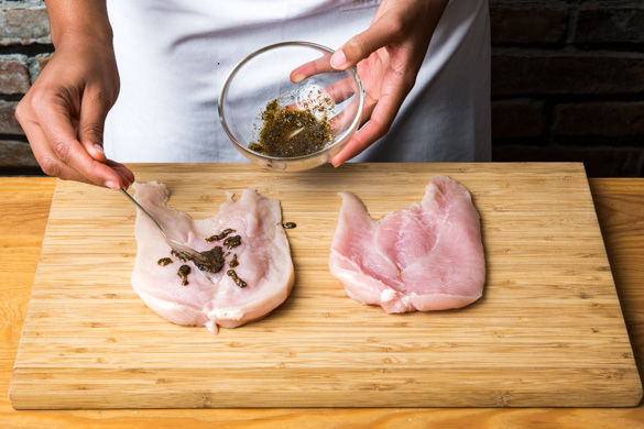 Die Hähnchenbrüste quer halbieren, sodass die Scheiben aber noch miteinander verbunden sind. Die Hähnchenbrust dann, wie ein Schmetterling aussehend, aufklappen und von beiden Seiten mit dem Gewürzöl bestreichen.