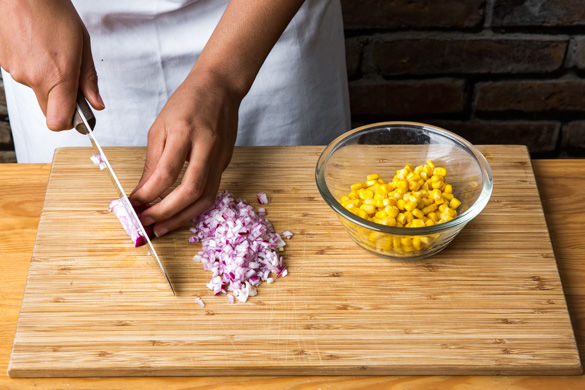 Inzwischen den Mais in einem Sieb abtropfen lassen. Die Zwiebel schälen, halbieren und in feine Würfel schneiden.