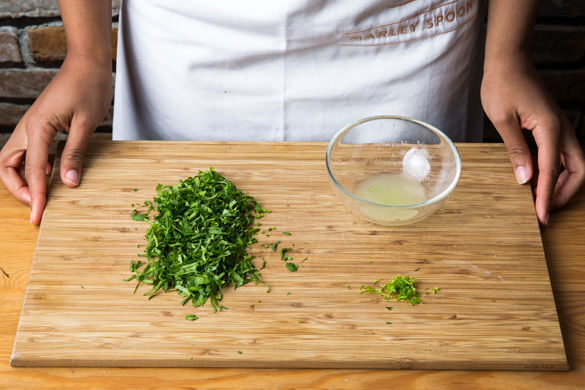 Die Schale der Limette abreiben und den Saft auspressen. Den Koriander mit Stängeln fein schneiden.