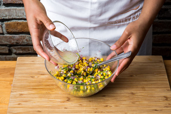 Den Mais mit der geschnittenen Zwiebel und Koriander, Limettenabrieb und 1-2TL Limettensaft sowie 1-2 El Olivenöl mischen und mit Salz und Pfeffer nach Wunsch abschmecken.