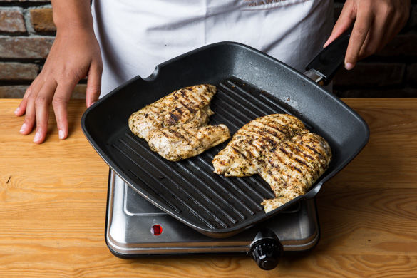 Zum Schluss den Grill oder eine Grillpfanne sehr stark erhitzen und die Pita Brote ca. 1-2Min. aufbacken. Im Anschluss die marinierten Hähnchenscheiben ca. 2-3Min. von jeder Seite grillen und mit dem Pita-Brot und Salsa servieren.