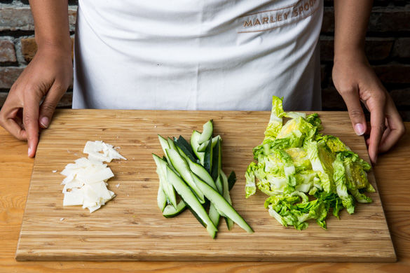 Inzwischen den Strunk des Salats entfernen und in ca. 1cm dünne Streifen schneiden. Die Gurke ggfs. schälen, längs vierteln, das Kerngehäuse entfernen und die Gurke in schräge Scheiben schneiden. Den Käse mit einem scharfen Messer oder einer Reibe in Scheiben schneiden.