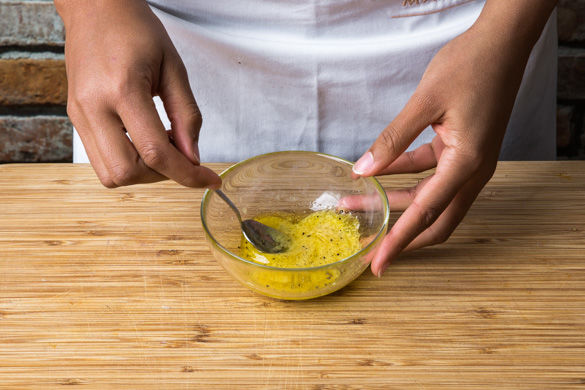 Den Senf mit 2-3EL Essig, 1-2EL Olivenöl und 1 Prise Zucker sowie Salz und Pfeffer zu einer Vinaigrette mischen.
