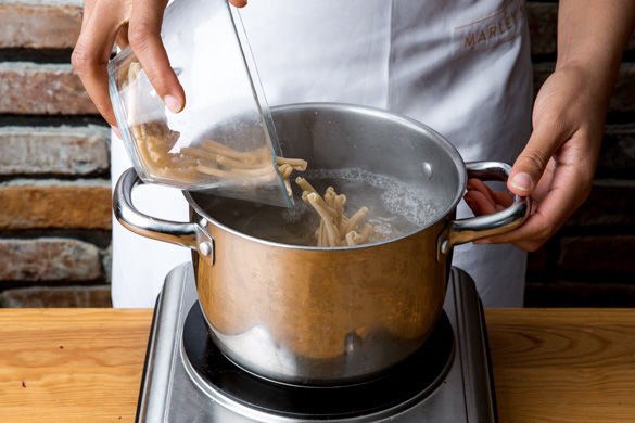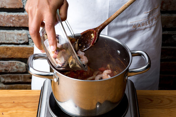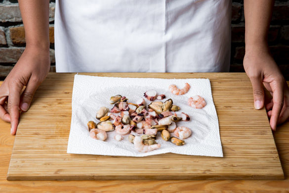 In einem mittelgroßen Topf ausreichend gesalzenes Wasser für die Nudeln aufsetzen. Inzwischen die Meeresfrüchte ggfs. in einem warmen Wasserbad auftauen lassen. Sonst abspülen und auf etwas Küchenkrepp trocken legen.