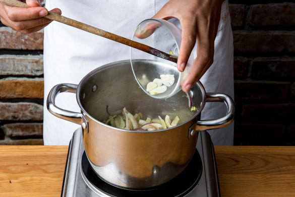 Die Zwiebel und die Knoblauchzehe schälen, beide halbieren und in feine Scheiben schneiden.