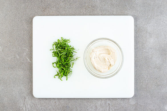 Die Basilikumblätter von den Stängeln zupfen und fein schneiden. Die Mayonnaise mit 1EL Balsamicoessig sowie je 1 Prise Salz und Pfeffer verrühren.