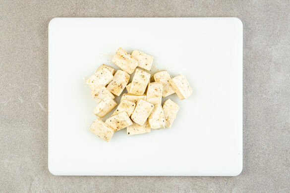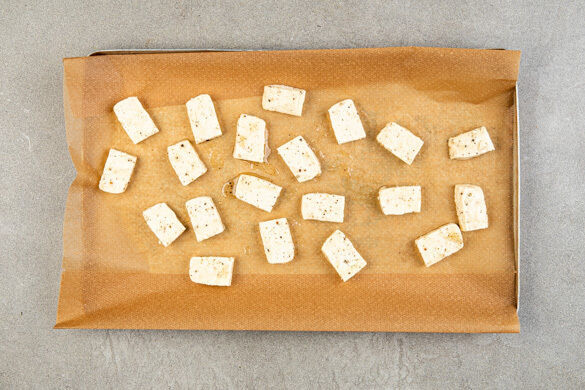 Den Tofu auf ein mit Backpapier ausgelegtes Backblech geben und gleichmäßig verteilen, sodass sich die Tofuscheiben nicht berühren. Im Ofen 20–24Min. goldbraun und knusprig backen.