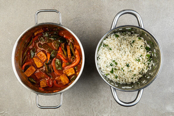 Na, mal wieder Lust auf leckeres Curry? So ein Zufall – wir haben gerade eins im Angebot! Das heutige Exemplar kommt mit knackiger Paprika, zarten grünen Bohnen und goldbraun gebackenen Tofuscheiben daher. Sie alle baden in einer köstlichen Sauce, die dank Ingwer, Knoblauch und einer leckeren Gewürzmischung richtig viel Aroma auf den Tisch bringt. Dazu gibt es natürlich flockigen Reis, garniert wird mit feinem Koriander. Mmmh!