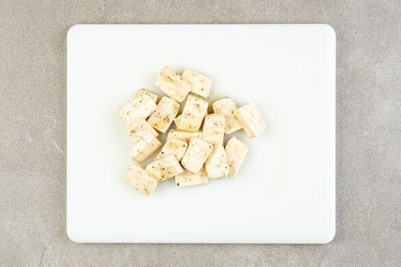 Den Tofu auf ein oder ggf. zwei mit Backpapier ausgelegte(s) Backblech(e) geben und gleichmäßig verteilen, sodass sich die Tofuscheiben nicht berühren. Im Ofen 20–24Min. goldbraun und knusprig backen.