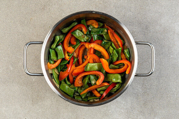 Die Zwiebeln schälen, halbieren und grob würfeln. Die Zwiebeln in einem großen Topf mit 4EL Margarine bei mittlerer Hitze 5–7Min. anschwitzen. Die Paprika vierteln, entkernen und in dünne Streifen schneiden. Die Bohnen in ca. 4cm große Stücke schneiden, dabei die Enden entfernen. Die Paprika und die Bohnen zu den Zwiebeln geben und ca. 5Min. mitbraten.
