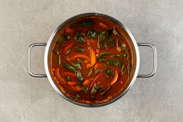 Den Knoblauch und den Ingwer schälen und fein reiben, dann mit dem Tomatenmark und der Gewürzmischung zu dem Gemüse geben und ca. 1Min. anschwitzen. Mit 1EL Essig ablöschen, den Essig verdampfen lassen und 2TL Mehl untermengen. 300ml Wasser, das Brühgewürz und 1TL Zucker dazugeben. Das Curry aufkochen und bei mittlerer Hitze 7–10Min. einköcheln lassen.