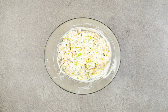 Den Mais in ein Sieb abgießen und abtropfen lassen. Den Schnittlauch in kleine Röllchen schneiden, dann mit der 1/2 des Maises, dem Mehl und dem veganen Käse zum Lauch geben und vermengen. Die Sojasahne und je 1 kräftige Prise Salz und Pfeffer hinzufügen und untermengen.
