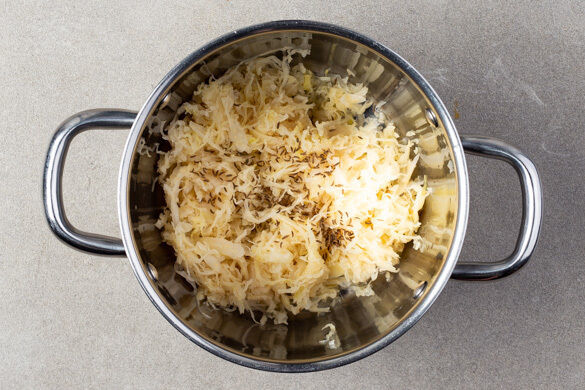 In einem mittelgroßen Topf die 1/2 des Sauerkrauts mit 1TL Kümmel bei mittlerer Hitze unter gelegentlichem Rühren erwärmen. Nach Geschmack mehr Kümmel zugeben und mit Salz würzen. Tipp: Wer großen Hunger hat, kann auch mehr Sauerkraut verwenden.