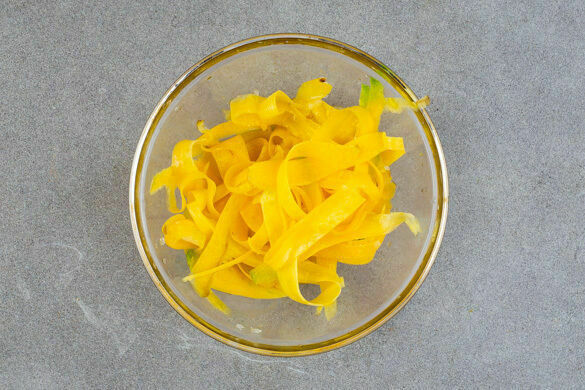 4EL hellen Essig gründlich mit 1EL Zucker und 1 kräftigen Prise Salz verrühren. Die Karotten ggf. schälen und mit einem Sparschäler in breite Streifen schneiden. Den Einlegesud vorsichtig in die Karottenstreifen einmassieren.
