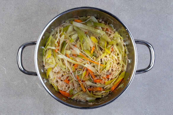 Den Reis in einem Sieb kalt abspülen, bis das Wasser klar bleibt, dann in den Topf zu dem Gemüse geben. Die Zwiebelmarmelade einrühren und das kochende Wasser angießen. Den Reis aufkochen und abgedeckt bei niedriger Hitze 13–15Min. kochen, bis das Wasser aufgesogen und der Reis gar ist, dabei gelegentlich umrühren. Noch ca. 5Min. ohne Hitzezufuhr ziehen lassen.