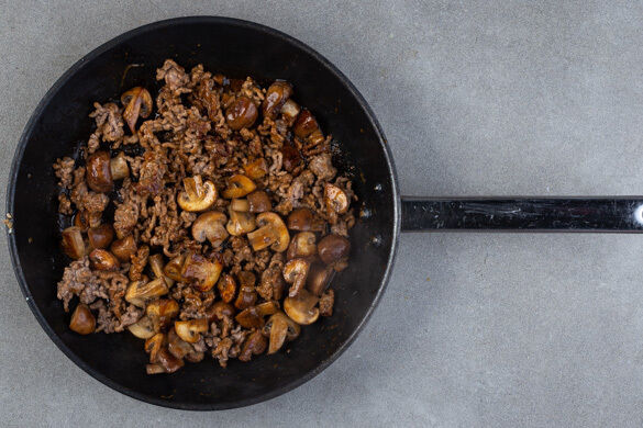 „Umami“ bedeutet im Japanischen so viel wie „Schmackhaftigkeit“. Genau das bekommst du heute auf deinen Teller: Champignons und Hackfleisch dürfen nämlich in einem ganzen Arsenal aromatischer Gewürze braten, und Misopaste bringt noch mehr Umami-Schwung mit ins Spiel. Auf fluffig klebrigem Sushireis mit bereits vorgeschnipseltem asiatischem Gemüse und süßsauer eingelegten Möhrenstreifen serviert ein Genuss!