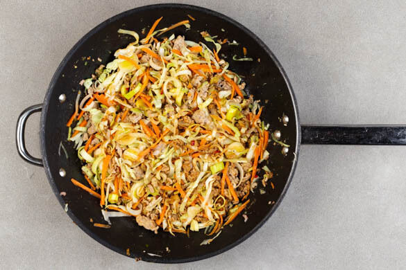 In einem großen Topf ausreichend gesalzenes Wasser für die Nudeln zum Kochen bringen. Das Hackfleisch, die weißen Lauchzwiebelringe und den Ingwer in einer großen Pfanne oder einem Wok mit 2EL Pflanzenöl, 1TL Salz und 1 kräftigen Prise Pfeffer bei mittlerer bis starker Hitze 3–4Min. anbraten, bis das Hackfleisch zu bräunen beginnt.