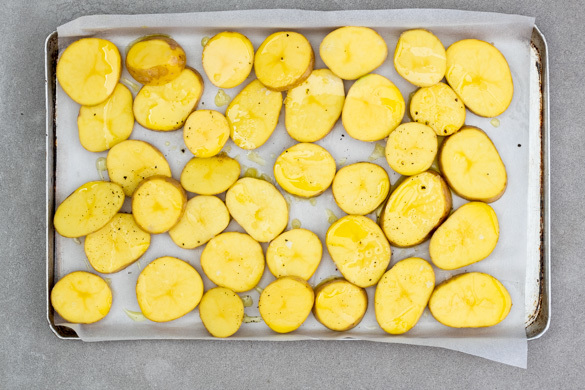 Den Backofen auf 220°C Umluft (240°C Ober-/Unterhitze) vorheizen. Die Kartoffeln in ca. 2cm dicke Scheiben schneiden, mit 1EL Olivenöl und etwas Salz mischen, auf einem mit Backpapier ausgelegten Backblech verteilen und ca. 10Min. im Ofen vorbacken.