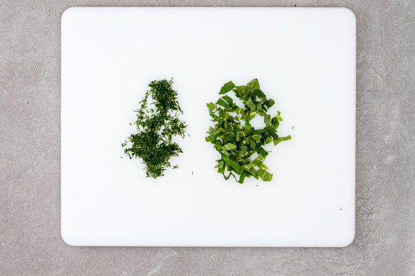 Die Minzeblätter abzupfen und in feine Streifen schneiden. Die Dillspitzen abzupfen und ebenfalls fein schneiden.