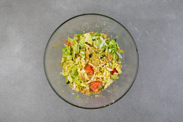 Ca. 1/3 des Chinakohls in dünne Streifen schneiden. Tipp: Wer mag, kann auch mehr Chinakohl verwenden. Die Gurke längs halbieren und quer in dünne Scheiben schneiden. Die Tomate in Spalten schneiden, dabei den Strunk entfernen. Die Petersilienblätter abzupfen und grob hacken. Die Rauchmandeln ebenfalls grob hacken.