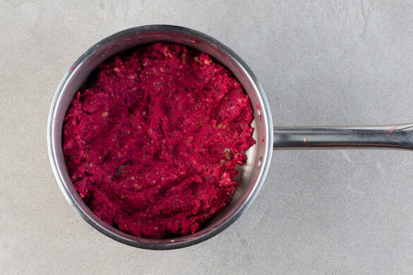 Die Rote Bete schälen und mit einer Küchenreibe grob raspeln. Die Kichererbsen in ein Sieb abgießen. Die Dillspitzen grob, die Dillstängel fein schneiden. Die Rote Bete, die Kichererbsen und die Dillstängel in einem kleinen Topf mit einem Stabmixer pürieren, dann 3–4EL Mehl, 1/2TL Salz und 1 kräftige Prise Pfeffer unterkneten.
