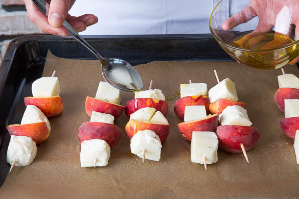 Inzwischen den Paneer-Käse in gleichgroße, ca. 2cm große Würfel schneiden. Die Pfirsiche halbieren, den Kern entfernen und die Hälften in Viertel schneiden. Nun abwechselnd Pfirsich und Käse auf die Holzspieße aufspießen.