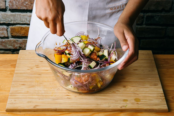 Nun die geschnittene Paprika, Zucchini und Zwiebel mit der Chorizo, den gehackten Rosmarin und der BBQ-Sauce in einer Schüssel vermengen und alles mit Salz und Pfeffer würzen.
