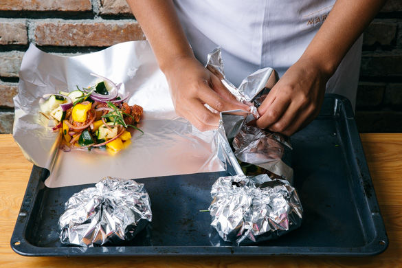 Nun 4 große Stücke Alufolie auf einem Backblech auslegen und die Füllung gleichmäßig darauf verteilen. Die Folie zu Päckchen zusammenfalten, sodass kein Bratensaft rausfließen kann und für ca. 25-30Min. in den Ofen oder ca. 15-20Min. auf den Grill geben, bis das Gemüse und Fleisch gar ist.