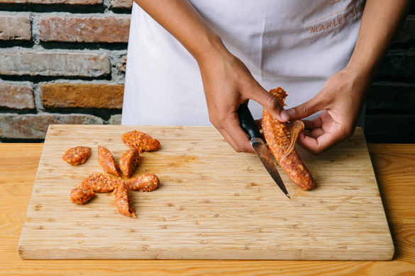 Die Chorizo vorsichtig mit einem Messer von der Pelle befreien und in ca. 1-2 cm dünne Scheiben schneiden. Den Umluftofen auf 200°C vorheizen oder, wer mag, den Grill vorbereiten.