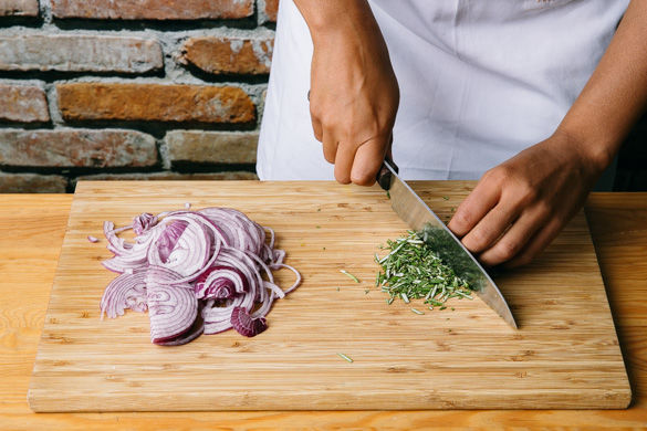 Die Zwiebel schälen, halbieren und in dünne Streifen schneiden. Die Blätter des Rosmarins vom Stängel streifen und grob hacken.