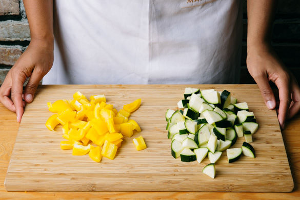 Die Paprika vierteln und vom Kerngehäuse befreien, die Zucchini längs vierteln und beides in 1-2 cm große Stücke schneiden.