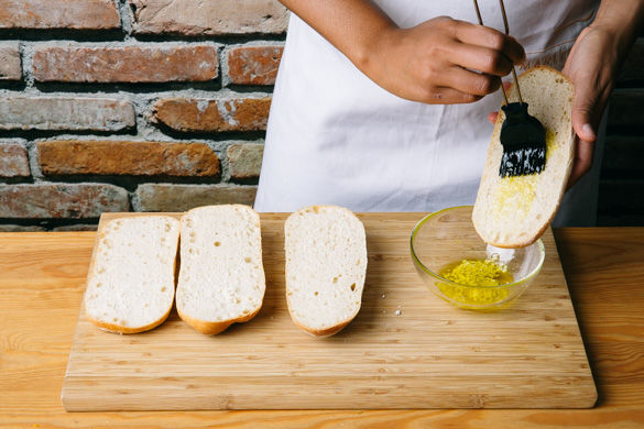 Inzwischen den Knoblauch schälen und in feine Würfel schneiden, dann mit 1-2EL Olivenöl und etwas Salz vermischen. Die Brötchen längs halbieren und mit dem Knoblauchöl bestreichen. Die Brötchen die letzten ca. 3-5Min. der Backzeit mit den Päckchen in den Ofen oder auf den Grill geben und gemeinsam servieren.