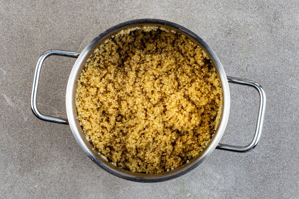 Die Quinoa in einem feinmaschigen Sieb mit warmem Wasser abspülen, in das kochende Wasser geben und 10–12Min. abgedeckt bei niedriger bis mittlerer Hitze sanft köcheln lassen. Vom Herd nehmen und bis zum Servieren warm halten.