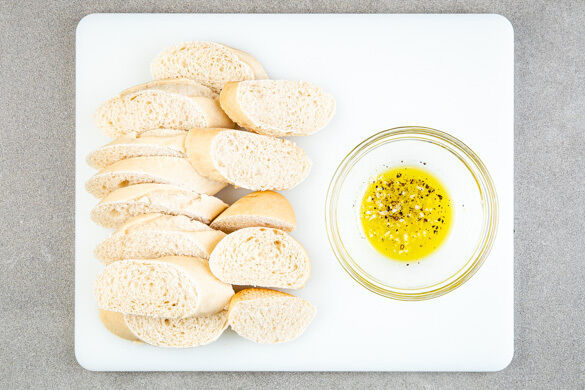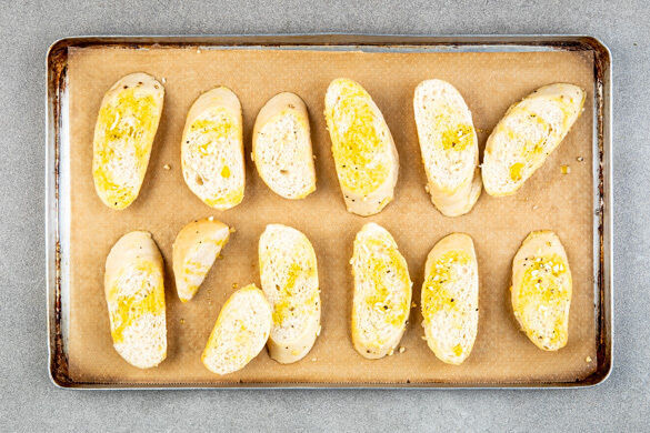 Die Brötchenscheiben auf einem mit Backpapier ausgelegten Backblech mit dem Knoblauchöl vermengen und gleichmäßig verteilen. Das Knoblauchbrot 8–10Min. im Ofen backen, bis es goldbraun und knusprig ist.