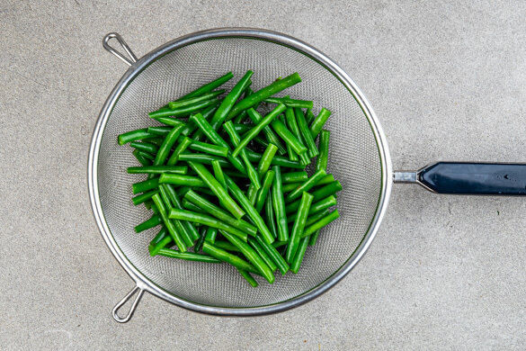 Die grünen Bohnen ins kochende Wasser geben und bei mittlerer Hitze 2–5Min. blanchieren, je nach gewünschter Bissfestigkeit. Die Bohnen mit einer Schaumkelle aus dem Topf nehmen, in ein Sieb geben und kalt abspülen, bis sie nicht mehr warm sind. Das Kochwasser im Topf lassen.