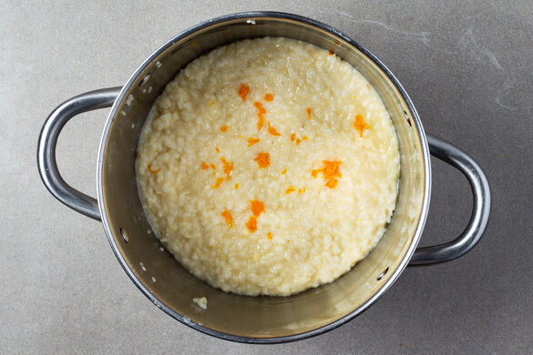 Den Reis mit 700ml heißem Leitungswasser und der Sahne ablöschen, dann den Vanillezucker, 2EL Zucker und 2 weitere Prisen Salz unterrühren und die Flüssigkeit zum Kochen bringen. Den Reis bei mittlerer bis niedriger Hitze ca. 15Min. sanft köcheln lassen, dabei regelmäßig umrühren, damit der Reis nicht anbrennt.