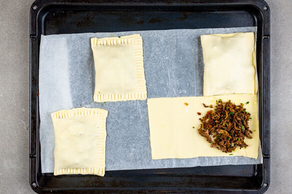 Den Teig mit dem Papier nach unten auf einem Backblech ausrollen und in 4 Rechtecke schneiden. Das Hackfleisch jeweils auf einer Hälfte verteilen und die andere Hälfte darüberklappen. Die Kanten gut zusammendrücken. Die gefüllten Teigtaschen anschließend 10–12Min. im Ofen goldbraun backen.