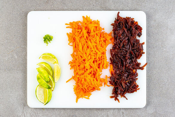 Die Karotte ggf. schälen und mit einer Küchenreibe grob raspeln. Die Rote Bete ebenfalls grob raspeln. Die Limettenschale abreiben und die Limette in 4 Spalten schneiden. Tipp: Da Rote Bete stark färbt, beim Verarbeiten am besten Küchenhandschuhe und Schürze tragen.