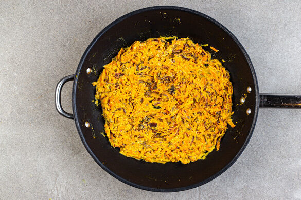 Die Currypaste in einer mittelgroßen Pfanne mit 1EL Pflanzenöl bei mittlerer bis niedriger Hitze 3–4Min. anbraten, dabei darauf achten, dass die Paste nicht anbrennt. Die Karotten dazugeben und 2–3Min. mitbraten. Die Pfanne vom Herd nehmen und die Rote Bete und den Joghurt einrühren.