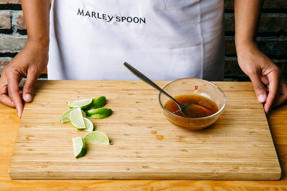 Die Limettenschale abreiben, dann die Limetten halbieren. Zwei Limettenhälften auspressen, die anderen beiden Hälften in Spalten schneiden. Den Limettensaft und -abrieb mit ca. 2/3 der Sweet Chili Sauce verrühren und mit etwas Pfeffer abschmecken.