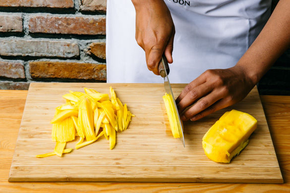 Die Mango schälen und das Fruchtfleisch mit einem Messer längs, ca. 0,5cm links und rechts vom oberen Stiel abschneiden. Das übrige Fruchtfleisch mit einem kleinen Messer vom Kern abschälen. Das Fruchtfleisch in feine Streifen schneiden.