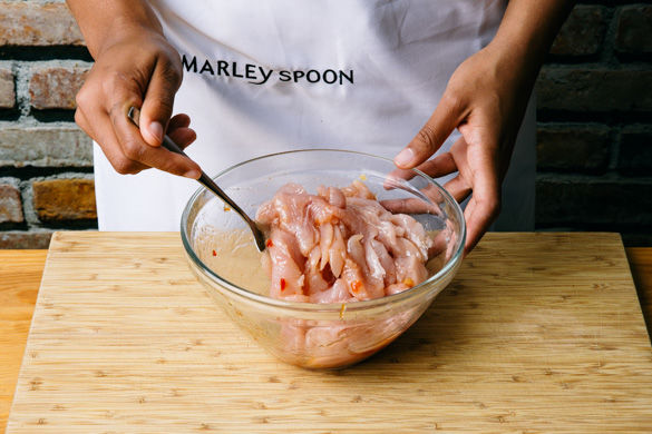 Das Hähnchenfleisch mit etwas Küchenkrepp trocken tupfen und in 0,5–1cm dünne Streifen schneiden. Mit 1EL Pflanzenöl und der restlichen Sweet Chili Sauce gut vermischen und zum Marinieren beiseitestellen.