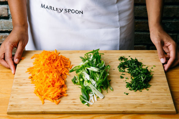Die Karotten schälen, die Enden abschneiden und die Karotte grob raspeln. Die Lauchzwiebeln in schräge, dünne Ringe schneiden. Den Koriander samt Stängeln fein hacken.