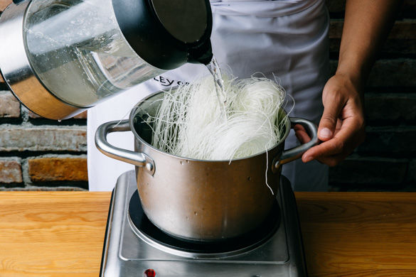 Inzwischen in einem Wasserkocher 1,5L Wasser zum Kochen bringen und die Glasnudeln in einem großen Topf damit übergießen. Mit etwas Salz würzen und ca. 1–2Min. ziehen lassen. Die Nudeln in ein Sieb abgießen und mit Mango, Lauchzwiebeln, Karotten, Koriander und Sauce mischen. Mit den Hähnchenstreifen, den Limettenspalten und Erdnüssen servieren.