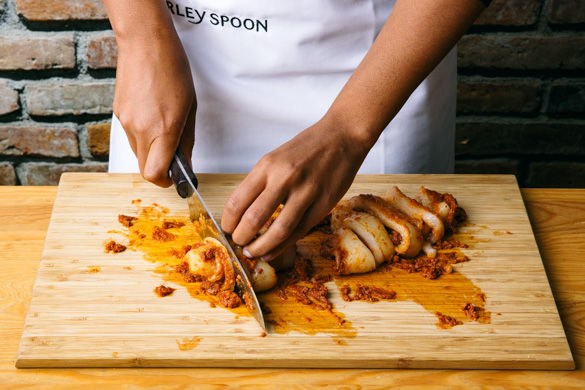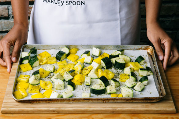 Die Zucchini vom Strunk befreien, längs vierteln und in ca. 1-2 cm große Scheiben schneiden, die Paprika vom Kerngehäuse befreien und ebenso in 1-2 cm große Stücke schneiden. Beides mit 2EL Olivenöl und dem Fischgewürz marinieren und auf eine Seite des mit Backpapier belegten Backblechs verteilen.