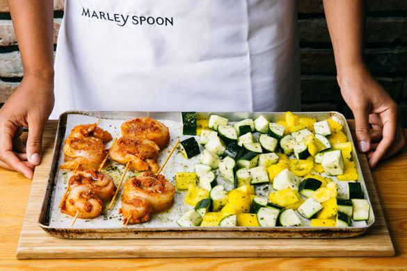 Die Fischröllchen auf die Spieße aufreihen und auf die freie Seite des Backpapiers legen. Die Spieße und das Gemüse für ca. 15-18Min. im Ofen garen, bis der Fisch und das Gemüse durch sind..