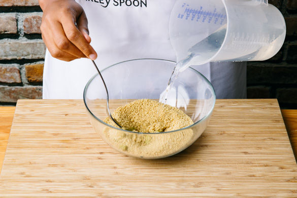 In der Zwischenzeit 300ml Wasser in einem Wasserkocher aufkochen und den Brühwürfel in einer Schüssel im Wasser auflösen. Den Couscous einstreuen und ca. 8-10Min. abgedeckt ziehen lassen.