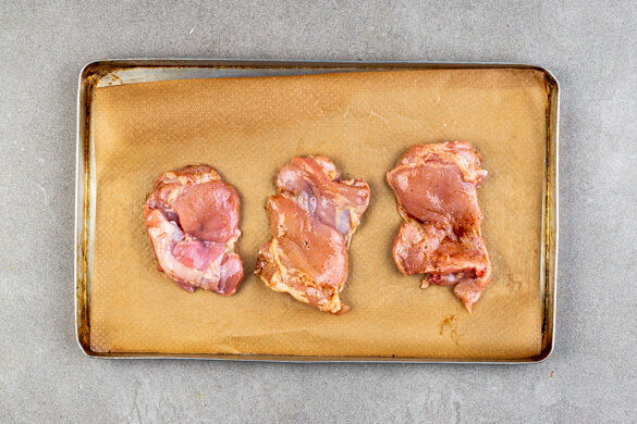 Den Backofen auf 220°C Umluft (240°C Ober-/Unterhitze) vorheizen. Das Fleisch trocken tupfen und auf einem mit Backpapier ausgelegten Backblech mit 1EL Pflanzenöl, der 1/2 der Gewürzmischung und je 1 Prise Salz und Pfeffer einreiben. Im Ofen 15–20Min. backen, bis das Fleisch knusprig und gar ist.